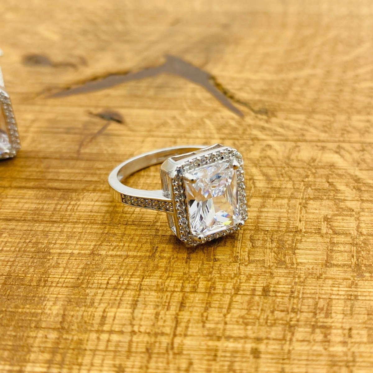 - Includes ring, necklace, and earrings with sparkling White Zircon stones.