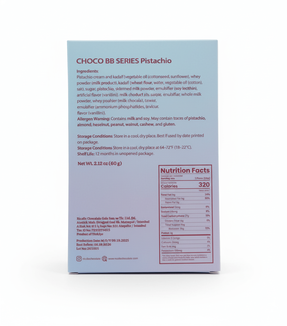 - Concept de dessert tendance : Profitez de la popularité mondiale des desserts du Moyen-Orient et des chocolats gourmets fourrés à la pistache. Cette barre est un vendeur garanti pour les épiceries ethniques et les détaillants grand public.