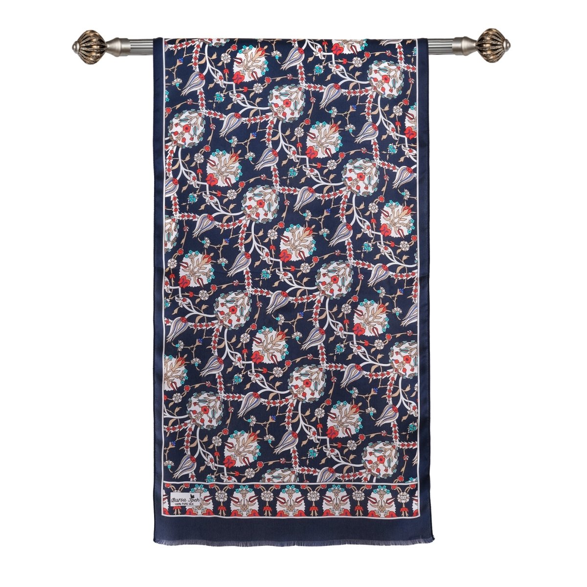 Geïnspireerd door artistieke Lale-patronen, weeft deze sjaal een betoverende symfonie van Black met accenten van Orange, Turquoise en Cream, die hedendaagse verfijning toont.